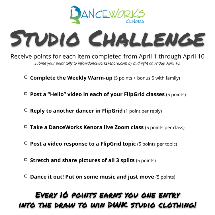 DWK families, we’ve started a studio challenge! Receive points for each item completed from today through April 10. Every 10 points gets you one entry in a draw to win DanceWorks Kenora clothing! Keep track of your points and submit your tally by midnight on Friday, April 10. (Ms. Erin will also be keeping track of FlipGrid and public posts but make sure you send your tally in as well.) PS. Already said hello or participated in your FlipGrid classes, those will count towards your tally for this challenge too.