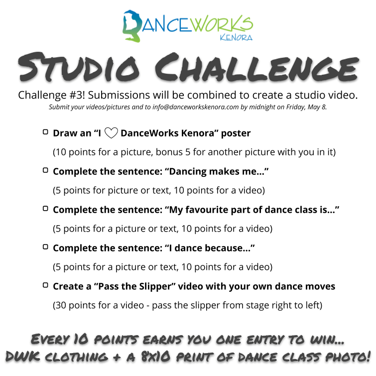 The next studio challenge is all about your love of dance and being part of the dance studio community. Every 10 points earns you one entry to win DWK clothing and an 8×10 print of one of your dance class group photos! Thanks to Colleen Serban for contributing to this draw prize. (PS. Thank you to everyone for your patience on the dance photos as they took a backseat to other pandemic related rescheduling, etc. The gallery link is being prepared now and we should be able to send that out to everyone soon!)
