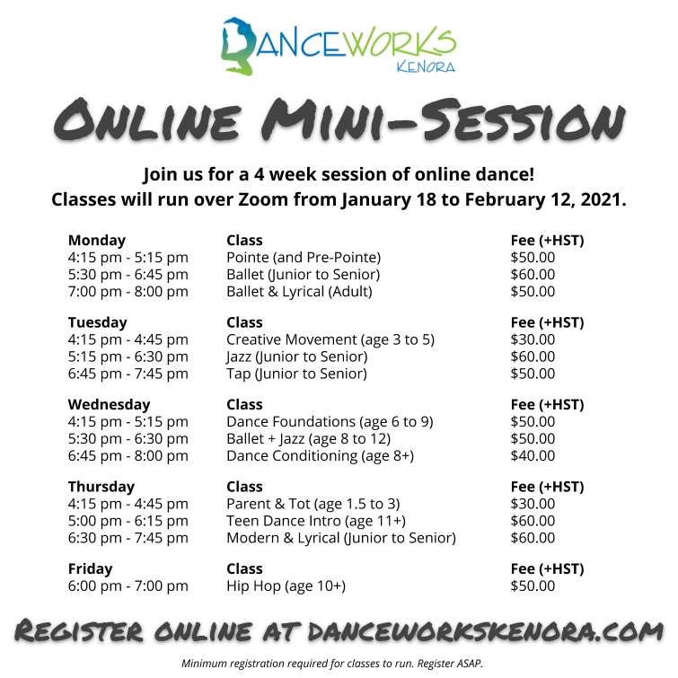 Join us for a 4 week online mini-session with online dance classes running from January 18 to February 12, 2021.
