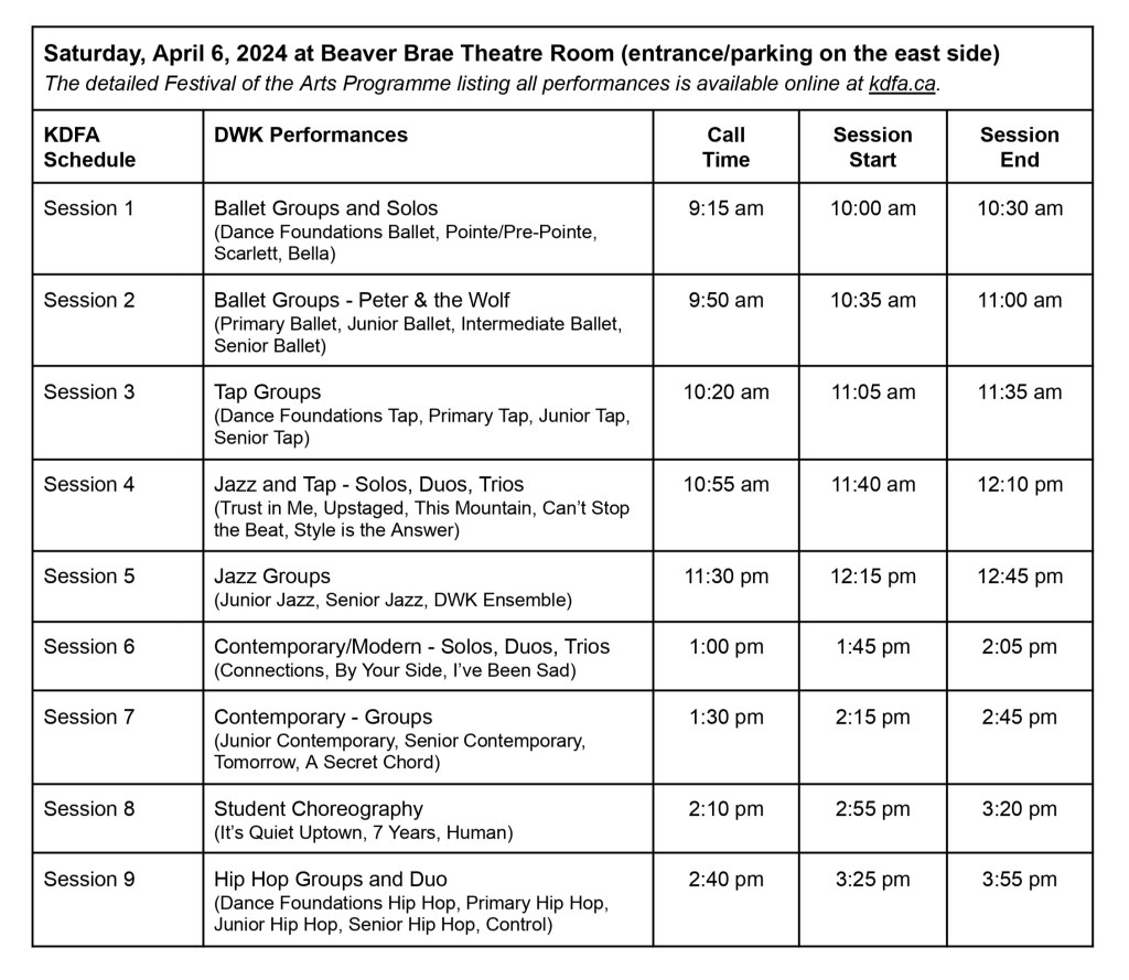 Call time is the time that dancers need to be at the venue, dressed and with all hair and makeup done, and ready to begin warm-up and performance preparations. Classes will be gathered to line up before their session and will remain near the stage entrance immediately after their performance in order to return to the stage for adjudication. After their adjudication for their session is complete dancers can be picked up or are free to join their families in the audience. We encourage dancers and families to stay and watch another session to support the other dancers and learn from their performances.