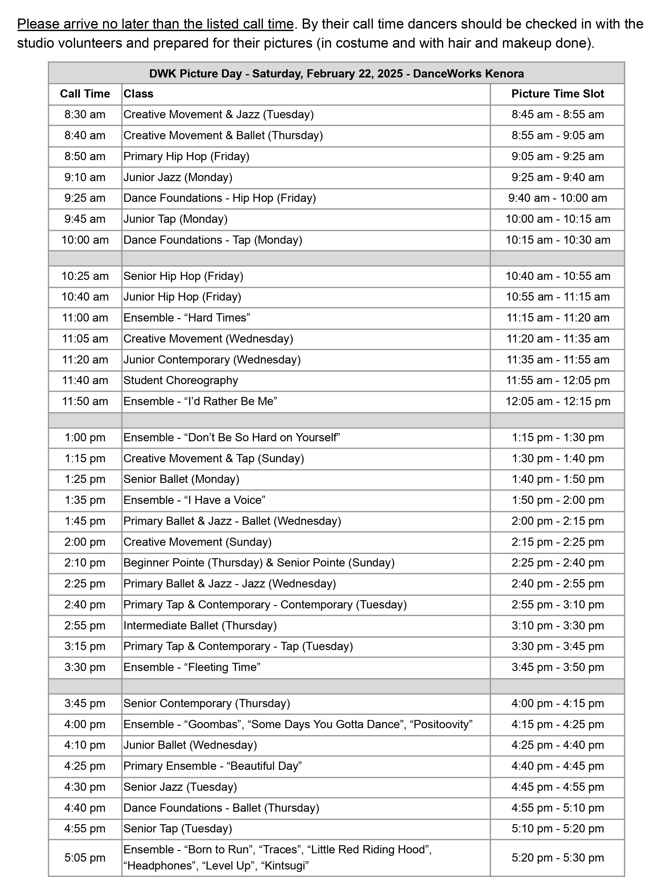 Attendance is requested at Picture Day as the goal is for the group photo for each class to include all dancers. If you know you are unable to attend or if there is illness or an unexpected conflict on Picture Day please notify Ms. Erin as soon as possible.