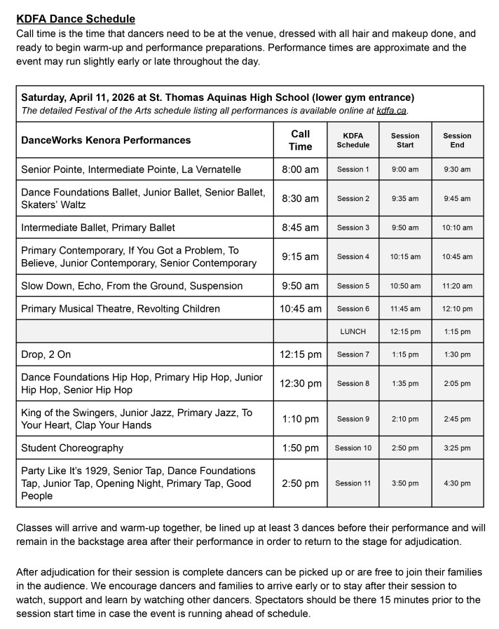 All Dance Foundations, Primary, Junior, Intermediate, Senior, and Ensemble classes participate in the Kenora District Festival of the Arts (KDFA). This is an educational performance opportunity where classes perform and receive feedback from an adjudicator. The dance adjudicators for 2026 are Magdalena McGregor and Willow Harvey. You can read their bios at kdfa.ca/adjudicators